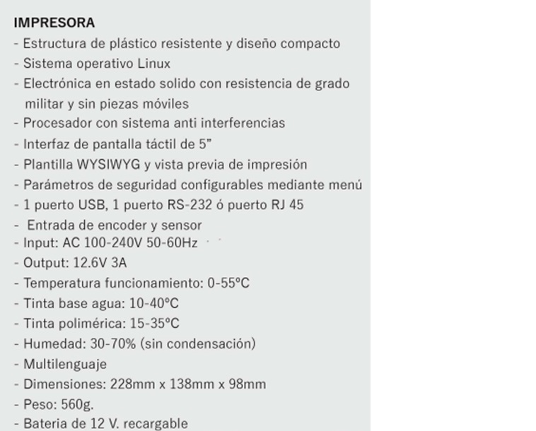 Impresora inkjet portátil de alta resolución para el marcaje tanto manual, como fija en línea de producción. Con un rango de altura de mensaje de 1mm a 25.4mm, permite imprimir sobre cualquier superficie, mriales tanto porosos, como no porosos.